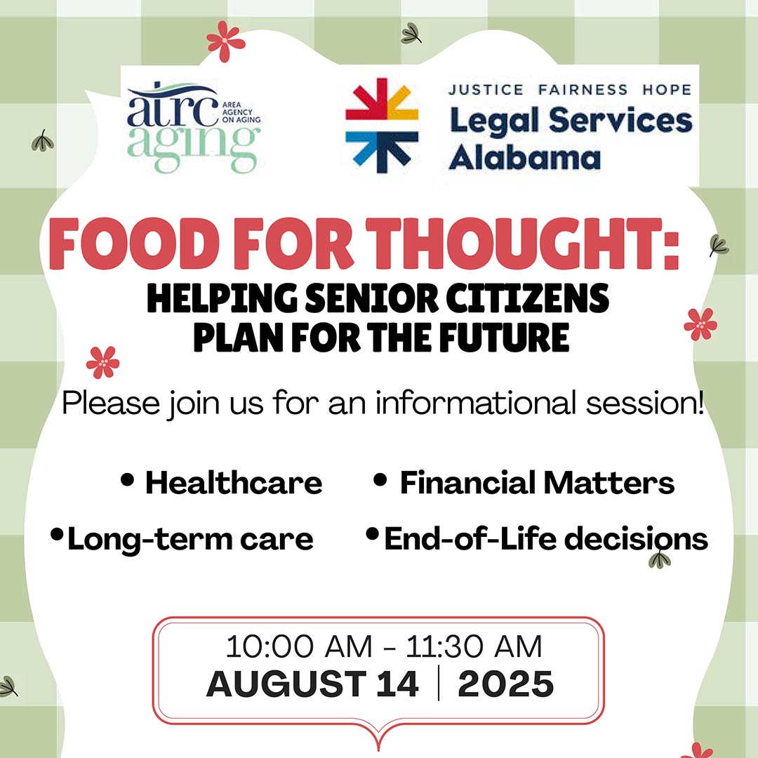 ATRC Aging will be hosting ‘Food for Thought: Helping Senior Citizens Plan for the Future’ on August 14, 2025, in Demopolis, AL. This informational event will discuss and answer questions about healthcare, long-term care, financial matters and end-of-life decisions. The event is free and light refreshments will be served, but registration is required. The Demopolis event will be held August 14, 2025, from 10 a.m. – 11:30 a.m., at the following location: